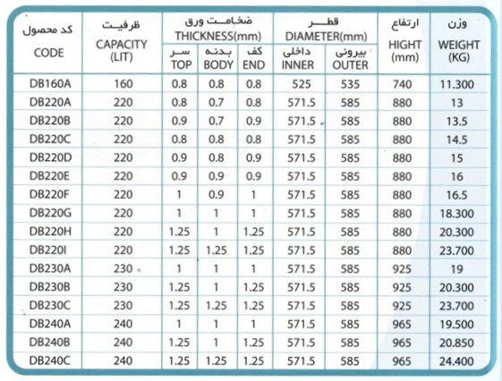 مشتریان میتوانند مشخصات مورد نظر خود را از جدول زیر انتخاب کرده و رنگ دلخواه (بر اساس کدهای رنگ استاندارد) و نوع پوشش داخلی مورد نیاز را ثبت سفارش کنند.